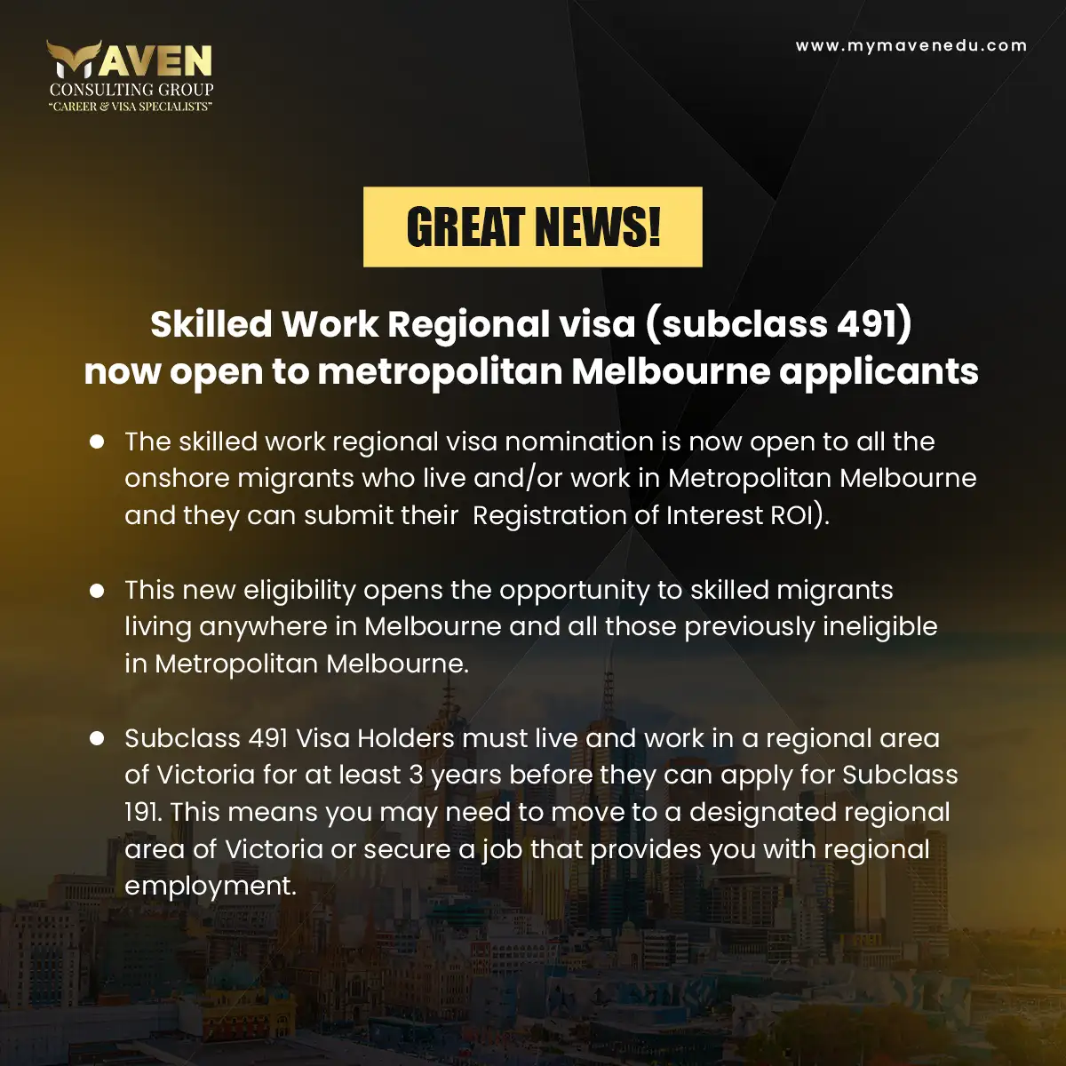 Skilled Work Regional Visa (SC 491) now open to Metropolitan Melbourne Applicants